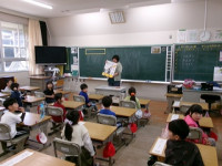 1年生にとっては初めての経験であり、読み聞かせに興味津々、目を輝かせて聞き入っていました。人の顔よりも大きな本にびっくりでした。